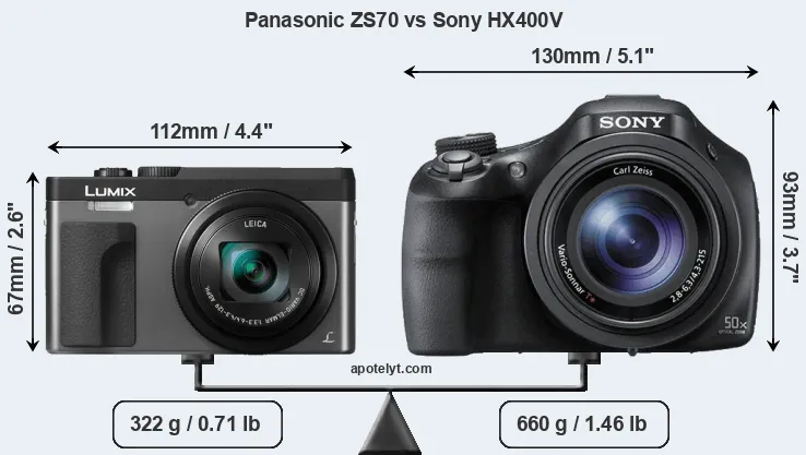If the front view area (width x height) of the cameras is taken as an aggregate measure of their size, the Sony HX400V is considerably larger (61 percent) than the Panasonic ZS70. Moreover, the HX400V is substantially heavier (105 percent) than the ZS70. In this context, it is worth noting that neither the ZS70 nor the HX400V are weather-sealed.
