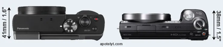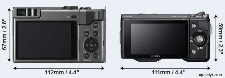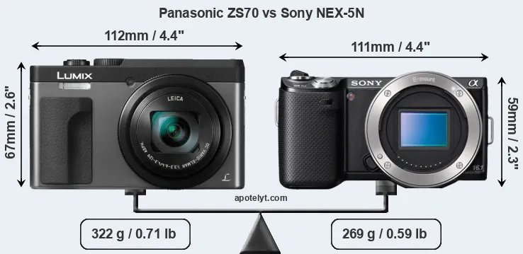 The side-by-side display below illustrates the physical size and weight of the Panasonic ZS70 and the Sony NEX-5N. The two cameras are presented according to their relative size. Three consecutive perspectives from the front, the top, and the back are available. All width, height and depth measures are rounded to the nearest millimeter.