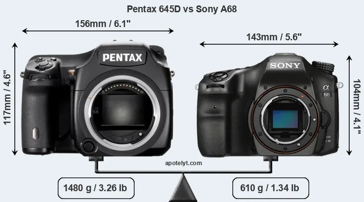 The physical size and weight of the Pentax 645D and the Sony A68 are illustrated in the side-by-side display below. The two cameras are presented according to their relative size. Three successive views from the front, the top, and the rear are shown. All width, height and depth measures are rounded to the nearest millimeter.