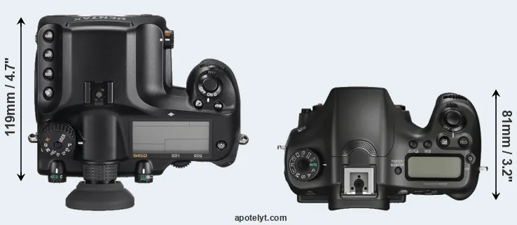 | 1. | Pentax 645D | 156 mm | 117 mm | 119 mm | 1480 g | 800 | Y | Mar 2010 | US$ 9 995 | ebay.com | |
