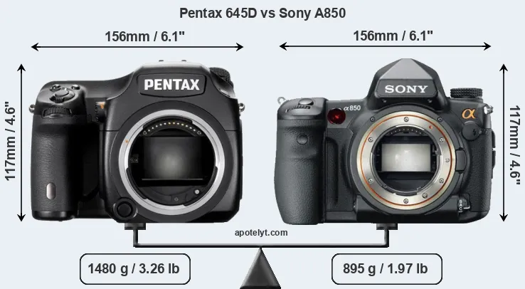 An illustration of the physical size and weight of the Pentax 645D and the Sony A850 is provided in the side-by-side display below. The two cameras are presented according to their relative size. Three consecutive views from the front, the top, and the rear side are shown. All width, height and depth dimensions are rounded to the nearest millimeter.