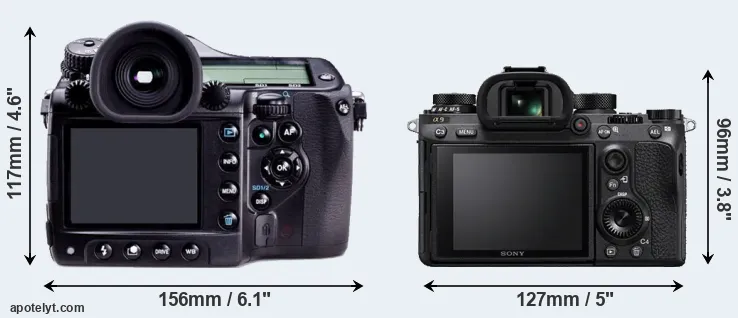 The side-by-side display below illustrates the physical size and weight of the Pentax 645D and the Sony A9. The two cameras are presented according to their relative size. Three successive views from the front, the top, and the rear are shown. All size dimensions are rounded to the nearest millimeter.