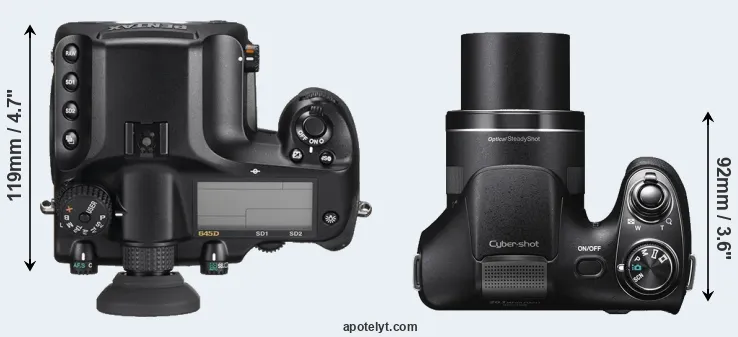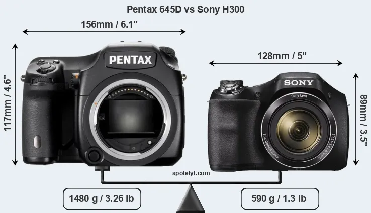 An illustration of the physical size and weight of the Pentax 645D and the Sony H300 is provided in the side-by-side display below. The two cameras are presented according to their relative size. Three consecutive perspectives from the front, the top, and the back are available. All width, height and depth dimensions are rounded to the nearest millimeter.