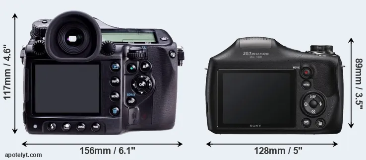 If the front view area (width x height) of the cameras is taken as an aggregate measure of their size, the Sony H300 is considerably smaller (38 percent) than the Pentax 645D. It is worth mentioning in this context that the 645D is splash and dust resistant, while the H300 does not feature any corresponding weather-sealing.
