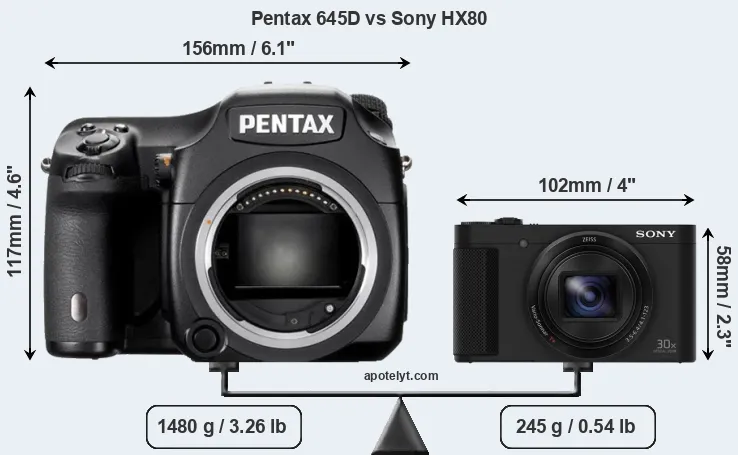 If the front view area (width x height) of the cameras is taken as an aggregate measure of their size, the Sony HX80 is considerably smaller (68 percent) than the Pentax 645D. It is worth mentioning in this context that the 645D is splash and dust resistant, while the HX80 does not feature any corresponding weather-sealing.