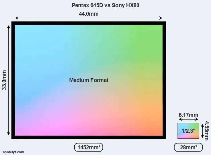 Of the two cameras under consideration, the Pentax 645D features a medium format sensor and the Sony HX80 a 1/2.3-inch sensor. The sensor area in the HX80 is 98 percent smaller. As a result of these sensor size differences, the cameras have a format factor of, respectively, 0.79 and 5.6. Both cameras feature a native aspect ratio (sensor width to sensor height) of 4:3.