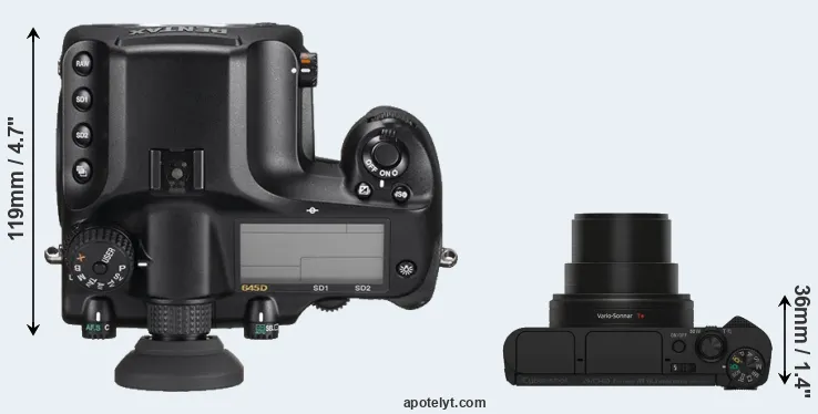 The physical size and weight of the Pentax 645D and the Sony HX80 are illustrated in the side-by-side display below. The two cameras are presented according to their relative size. Three consecutive views from the front, the top, and the rear side are shown. All size dimensions are rounded to the nearest millimeter.