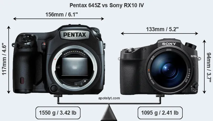 The side-by-side display below illustrates the physical size and weight of the Pentax 645Z and the Sony RX10 IV. The two cameras are presented according to their relative size. Three consecutive perspectives from the front, the top, and the back are available. All width, height and depth measures are rounded to the nearest millimeter.