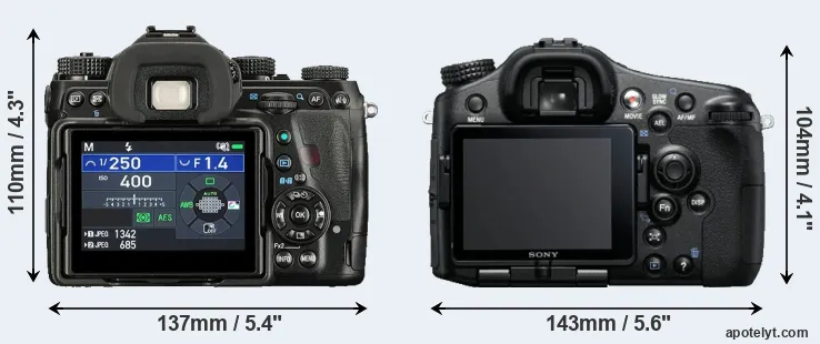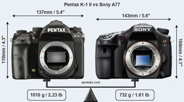 If the front view area (width x height) of the cameras is taken as an aggregate measure of their size, the Sony A77 is somewhat smaller (1 percent) than the Pentax K-1 II. Moreover, the A77 is markedly lighter (28 percent) than the K-1 II. In this context, it is worth noting that both cameras are splash and dust-proof and can, hence, be used in inclement weather conditions or harsh environments.