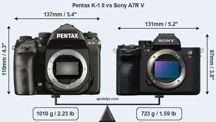 If the front view area (width x height) of the cameras is taken as an aggregate measure of their size, the Sony A7R V is notably smaller (16 percent) than the Pentax K-1 II. Moreover, the A7R V is markedly lighter (28 percent) than the K-1 II. In this context, it is worth noting that both cameras are splash and dust-proof and can, hence, be used in inclement weather conditions or harsh environments.
