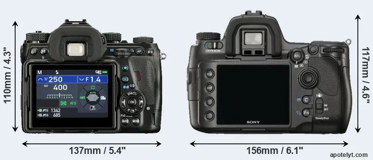 The side-by-side display below illustrates the physical size and weight of the Pentax K-1 II and the Sony A900. The two cameras are presented according to their relative size. Three successive views from the front, the top, and the rear are shown. All width, height and depth measures are rounded to the nearest millimeter.