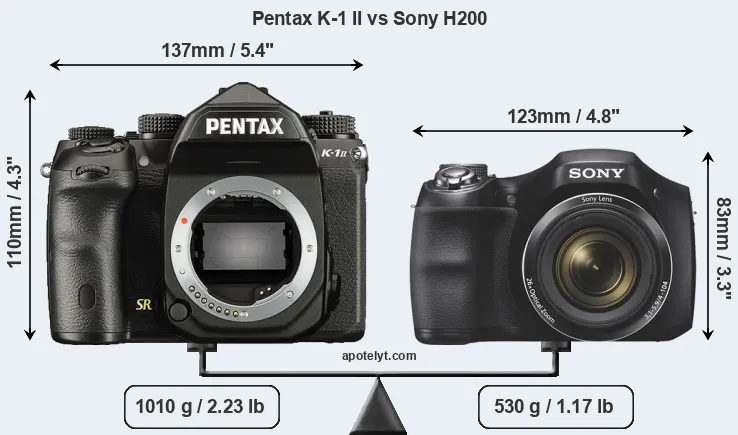 The side-by-side display below illustrates the physical size and weight of the Pentax K-1 II and the Sony H200. The two cameras are presented according to their relative size. Three consecutive views from the front, the top, and the rear side are shown. All width, height and depth dimensions are rounded to the nearest millimeter.