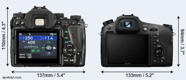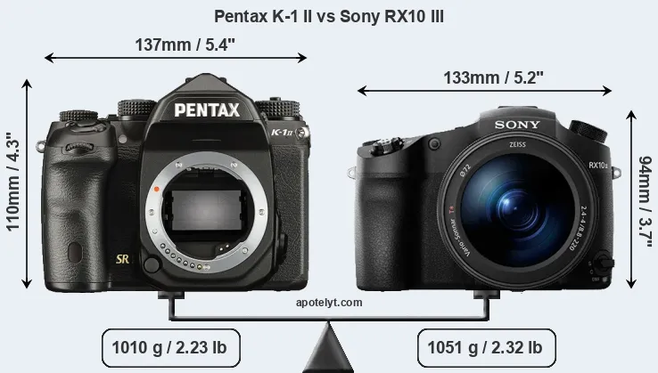 The side-by-side display below illustrates the physical size and weight of the Pentax K-1 II and the Sony RX10 III. The two cameras are presented according to their relative size. Three consecutive perspectives from the front, the top, and the back are available. All width, height and depth measures are rounded to the nearest millimeter.