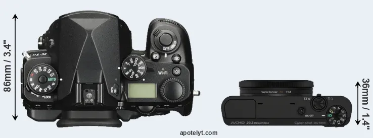 If the front view area (width x height) of the cameras is taken as an aggregate measure of their size, the Sony RX100 is considerably smaller (61 percent) than the Pentax K-1 II. It is worth mentioning in this context that the K-1 II is splash and dust resistant, while the RX100 does not feature any corresponding weather-sealing.