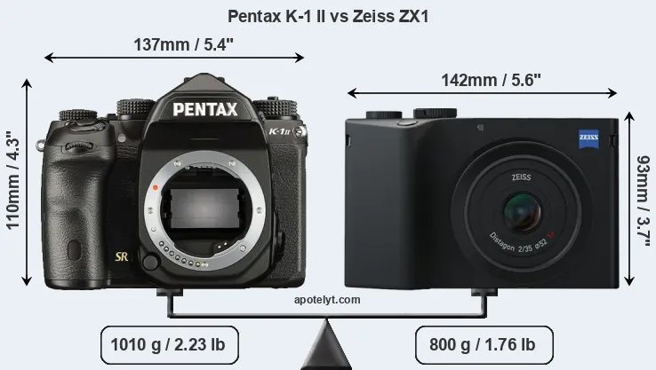 If the front view area (width x height) of the cameras is taken as an aggregate measure of their size, the Zeiss ZX1 is notably smaller (12 percent) than the Pentax K-1 II. It is worth mentioning in this context that the K-1 II is splash and dust resistant, while the ZX1 does not feature any corresponding weather-sealing.