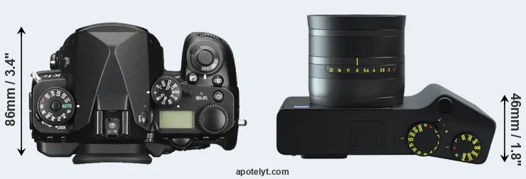 The side-by-side display below illustrates the physical size and weight of the Pentax K-1 II and the Zeiss ZX1. The two cameras are presented according to their relative size. Three consecutive perspectives from the front, the top, and the back are available. All width, height and depth dimensions are rounded to the nearest millimeter.
