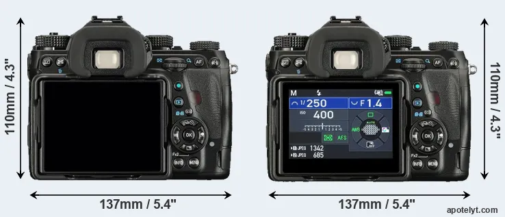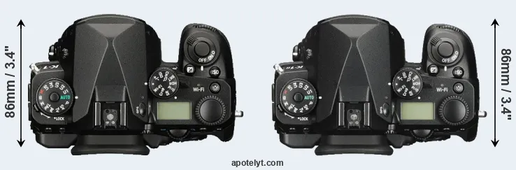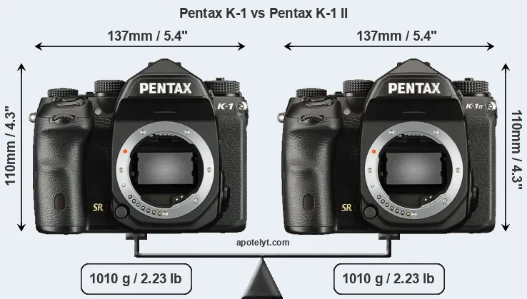 The side-by-side display below illustrates the physical size and weight of the Pentax K-1 and the Pentax K-1 II. The two cameras are presented according to their relative size. Three consecutive views from the front, the top, and the rear side are shown. All width, height and depth dimensions are rounded to the nearest millimeter.