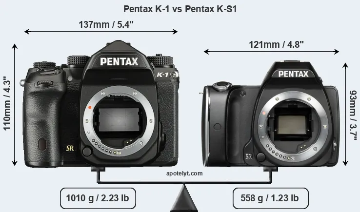If the front view area (width x height) of the cameras is taken as an aggregate measure of their size, the Pentax K-S1 is notably smaller (25 percent) than the Pentax K-1. Moreover, the K-S1 is substantially lighter (45 percent) than the K-1. It is worth mentioning in this context that the K-1 is splash and dust resistant, while the K-S1 does not feature any corresponding weather-sealing.