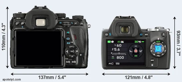 | 9. | Pentax K-3 II | 131 mm | 100 mm | 77 mm | 800 g | 720 | Y | Apr 2015 | US$ 1 099 | ebay.com | |