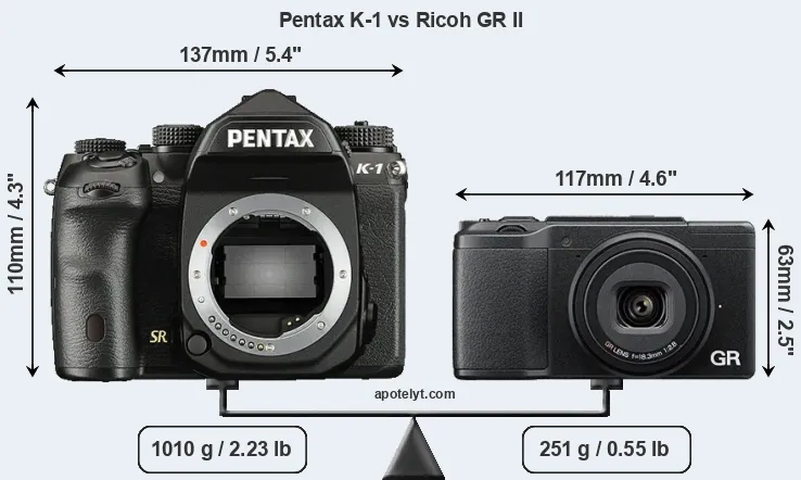 The above size and weight comparisons are to some extent incomplete and possibly misleading, as the GR II has a lens built in, whereas the K-1 is an interchangeable lens camera that requires a separate lens. Attaching the latter will add extra weight and bulk to the setup.