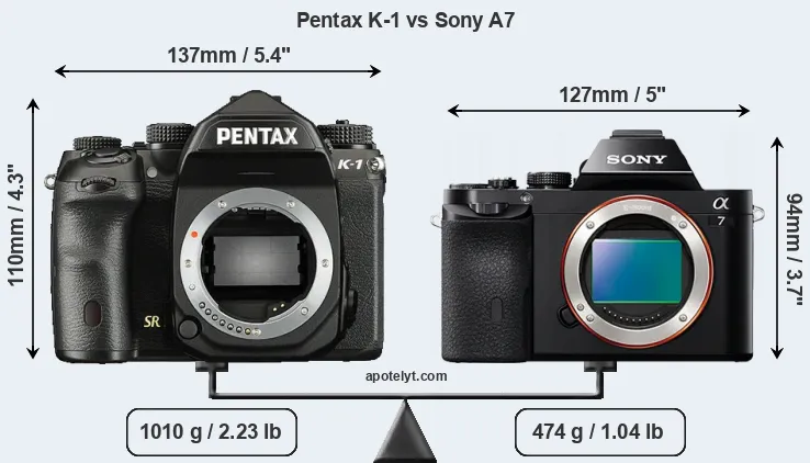 If the front view area (width x height) of the cameras is taken as an aggregate measure of their size, the Sony A7 is notably smaller (21 percent) than the Pentax K-1. Moreover, the A7 is substantially lighter (53 percent) than the K-1. In this context, it is worth noting that both cameras are splash and dust-proof and can, hence, be used in inclement weather conditions or harsh environments.
