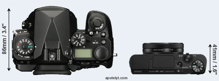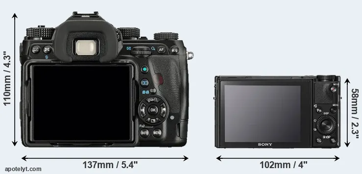 The side-by-side display below illustrates the physical size and weight of the Pentax K-1 and the Sony RX100 V. The two cameras are presented according to their relative size. Three successive views from the front, the top, and the rear are shown. All width, height and depth dimensions are rounded to the nearest millimeter.