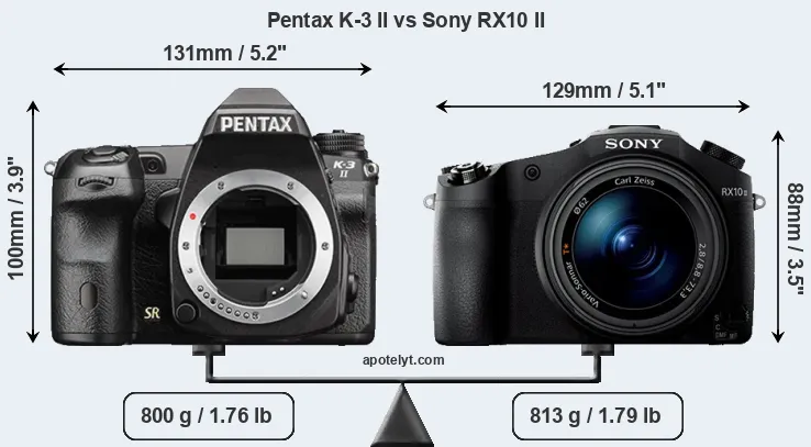 An illustration of the physical size and weight of the Pentax K-3 II and the Sony RX10 II is provided in the side-by-side display below. The two cameras are presented according to their relative size. Three successive views from the front, the top, and the rear are shown. All size dimensions are rounded to the nearest millimeter.