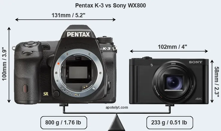 The above size and weight comparisons are to some extent incomplete and possibly misleading, as the WX800 has a lens built in, whereas the K-3 is an interchangeable lens camera that requires a separate lens. Attaching the latter will add extra weight and bulk to the setup.