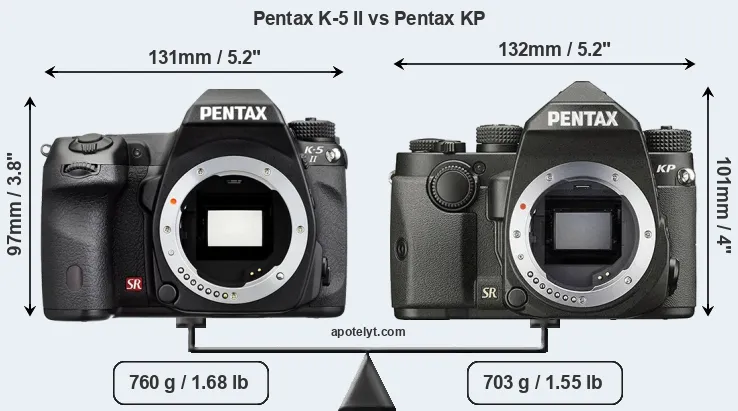 If the front view area (width x height) of the cameras is taken as an aggregate measure of their size, the Pentax KP is somewhat larger (5 percent) than the Pentax K-5 II. However, the KP is markedly lighter (8 percent) than the K-5 II. In this context, it is worth noting that both cameras are splash and dust-proof and can, hence, be used in inclement weather conditions or harsh environments.