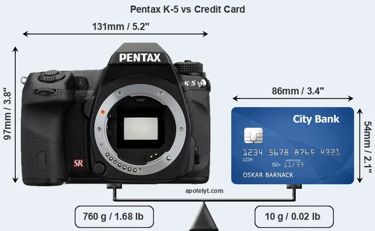The physical dimensions of the Pentax K-5 relative to a credit card are illustrated in the side-by-side display below. Three consecutive perspectives from the front, the top, and the back are presented. All width, height and depth dimensions are rounded to the nearest millimeter.