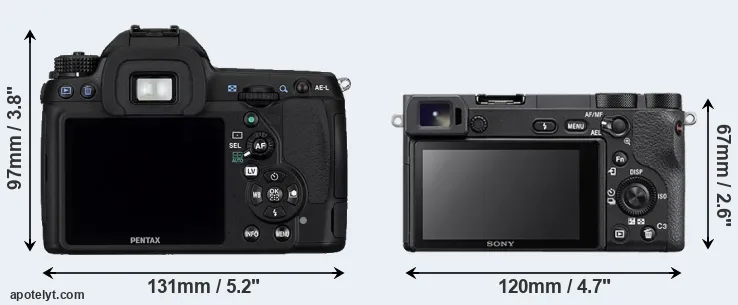 The side-by-side display below illustrates the physical size and weight of the Pentax K-5 and the Sony A6500. The two cameras are presented according to their relative size. Three successive views from the front, the top, and the rear are shown. All size dimensions are rounded to the nearest millimeter.