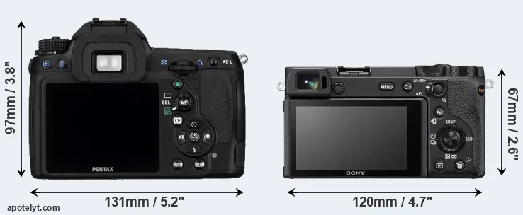 The side-by-side display below illustrates the physical size and weight of the Pentax K-5 and the Sony A6600. The two cameras are presented according to their relative size. Three successive views from the front, the top, and the rear are shown. All size dimensions are rounded to the nearest millimeter.
