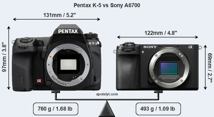 The physical size and weight of the Pentax K-5 and the Sony A6700 are illustrated in the side-by-side display below. The two cameras are presented according to their relative size. Three consecutive views from the front, the top, and the rear side are shown. All width, height and depth dimensions are rounded to the nearest millimeter.