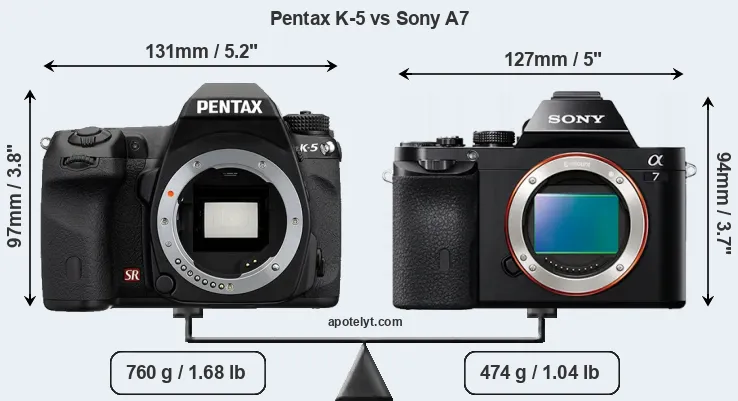 The physical size and weight of the Pentax K-5 and the Sony A7 are illustrated in the side-by-side display below. The two cameras are presented according to their relative size. Three successive views from the front, the top, and the rear are shown. All size dimensions are rounded to the nearest millimeter.