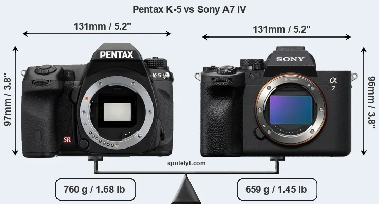 The side-by-side display below illustrates the physical size and weight of the Pentax K-5 and the Sony A7 IV. The two cameras are presented according to their relative size. Three consecutive perspectives from the front, the top, and the back are available. All width, height and depth measures are rounded to the nearest millimeter.