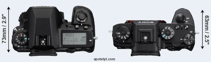 The physical size and weight of the Pentax K-5 and the Sony A9 are illustrated in the side-by-side display below. The two cameras are presented according to their relative size. Three consecutive perspectives from the front, the top, and the back are available. All size dimensions are rounded to the nearest millimeter.