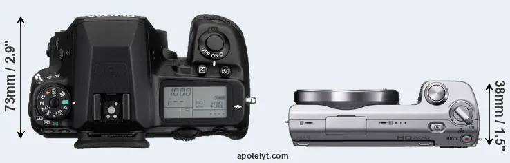 The physical size and weight of the Pentax K-5 and the Sony NEX-5 are illustrated in the side-by-side display below. The two cameras are presented according to their relative size. Three consecutive views from the front, the top, and the rear side are shown. All size dimensions are rounded to the nearest millimeter.