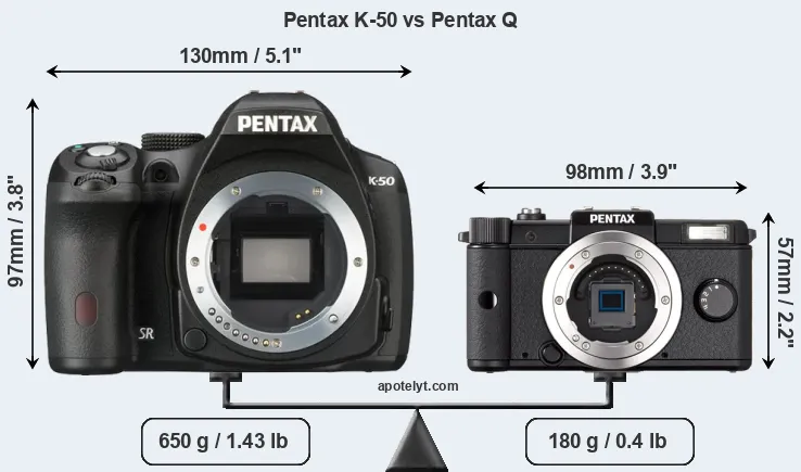 If the front view area (width x height) of the cameras is taken as an aggregate measure of their size, the Pentax Q is considerably smaller (56 percent) than the Pentax K-50. Moreover, the Pentax Q is substantially lighter (72 percent) than the K-50. It is worth mentioning in this context that the K-50 is splash and dust resistant, while the Pentax Q does not feature any corresponding weather-sealing.