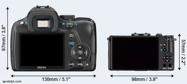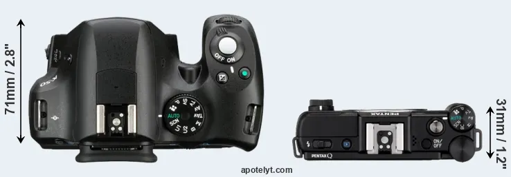 The side-by-side display below illustrates the physical size and weight of the Pentax K-50 and the Pentax Q. The two cameras are presented according to their relative size. Three consecutive views from the front, the top, and the rear side are shown. All width, height and depth dimensions are rounded to the nearest millimeter.