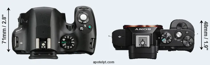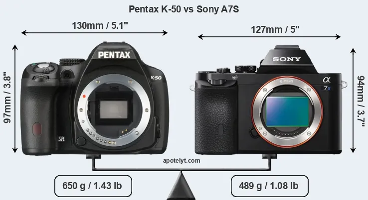 The physical size and weight of the Pentax K-50 and the Sony A7S are illustrated in the side-by-side display below. The two cameras are presented according to their relative size. Three consecutive views from the front, the top, and the rear side are shown. All width, height and depth dimensions are rounded to the nearest millimeter.