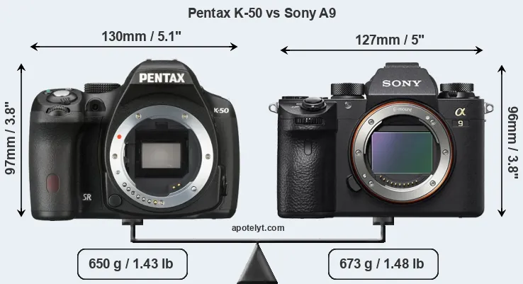An illustration of the physical size and weight of the Pentax K-50 and the Sony A9 is provided in the side-by-side display below. The two cameras are presented according to their relative size. Three successive views from the front, the top, and the rear are shown. All size dimensions are rounded to the nearest millimeter.