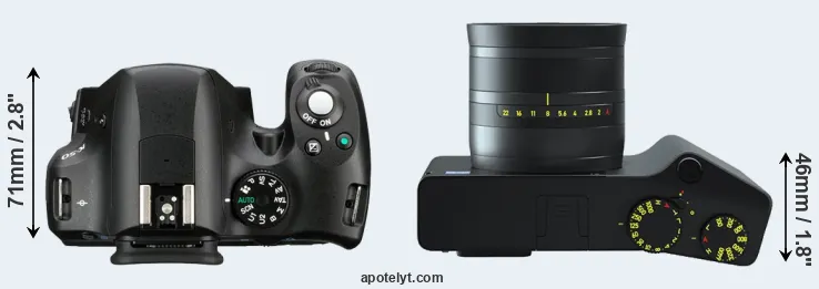The physical size and weight of the Pentax K-50 and the Zeiss ZX1 are illustrated in the side-by-side display below. The two cameras are presented according to their relative size. Three consecutive views from the front, the top, and the rear side are shown. All size dimensions are rounded to the nearest millimeter.
