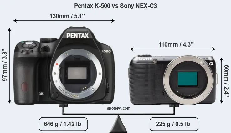 The side-by-side display below illustrates the physical size and weight of the Pentax K-500 and the Sony NEX-C3. The two cameras are presented according to their relative size. Three successive views from the front, the top, and the rear are shown. All width, height and depth measures are rounded to the nearest millimeter.