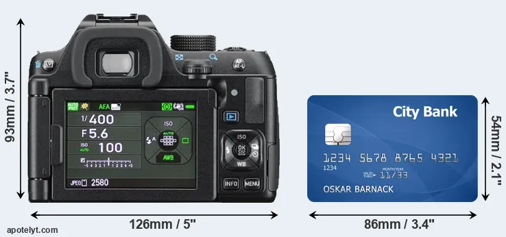 The side-by-side display below illustrates the physical size of the Pentax K-70 vis-à-vis a credit card. Three consecutive views from the front, the top, and the rear side are shown. All size dimensions are rounded to the nearest millimeter.