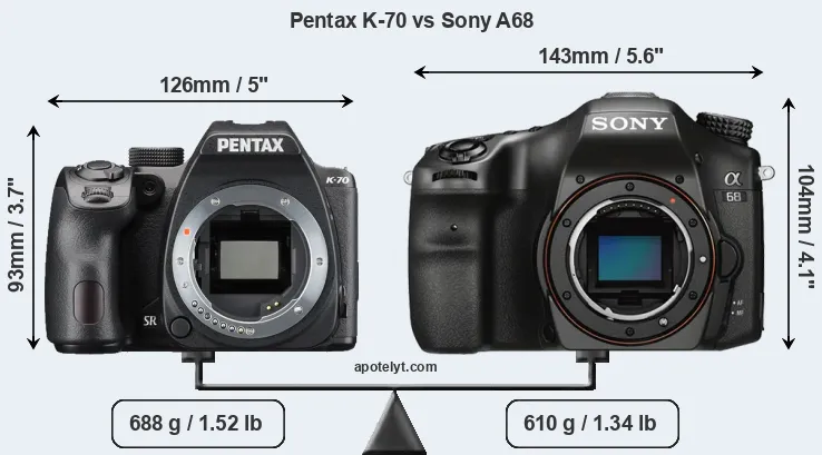 If the front view area (width x height) of the cameras is taken as an aggregate measure of their size, the Sony A68 is notably larger (27 percent) than the Pentax K-70. However, the A68 is markedly lighter (11 percent) than the K-70. It is worth mentioning in this context that the K-70 is splash and dust resistant, while the A68 does not feature any corresponding weather-sealing.