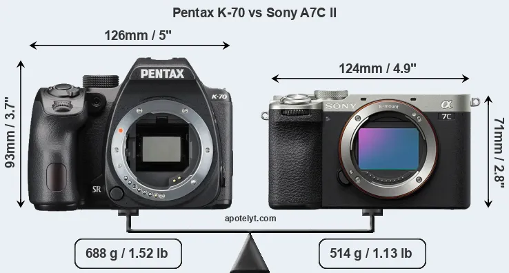 The physical size and weight of the Pentax K-70 and the Sony A7C II are illustrated in the side-by-side display below. The two cameras are presented according to their relative size. Three consecutive perspectives from the front, the top, and the back are available. All width, height and depth dimensions are rounded to the nearest millimeter.