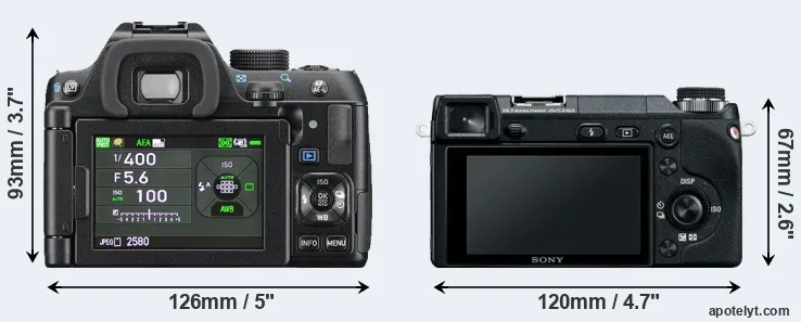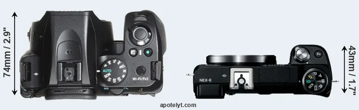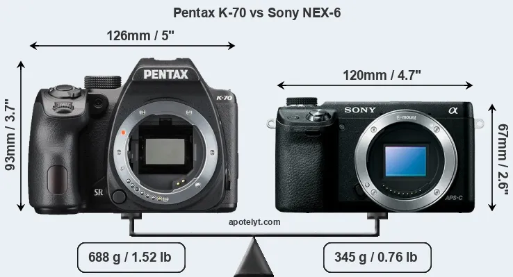 An illustration of the physical size and weight of the Pentax K-70 and the Sony NEX-6 is provided in the side-by-side display below. The two cameras are presented according to their relative size. Three successive views from the front, the top, and the rear are shown. All width, height and depth dimensions are rounded to the nearest millimeter.