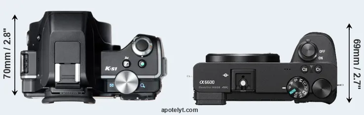 The physical size and weight of the Pentax K-S1 and the Sony A6600 are illustrated in the side-by-side display below. The two cameras are presented according to their relative size. Three consecutive views from the front, the top, and the rear side are shown. All size dimensions are rounded to the nearest millimeter.