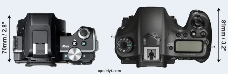 The physical size and weight of the Pentax K-S1 and the Sony A68 are illustrated in the side-by-side display below. The two cameras are presented according to their relative size. Three consecutive views from the front, the top, and the rear side are shown. All size dimensions are rounded to the nearest millimeter.