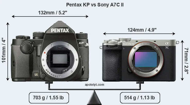 The physical size and weight of the Pentax KP and the Sony A7C II are illustrated in the side-by-side display below. The two cameras are presented according to their relative size. Three consecutive perspectives from the front, the top, and the back are available. All width, height and depth dimensions are rounded to the nearest millimeter.